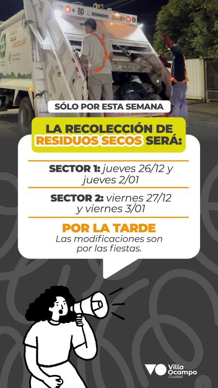 La Municipalidad de Villa Ocampo informa que, debido a las celebraciones de fin de año, la recolección de residuos secos (al caer miércoles 1° de enero), sufrirá modificaciones, llevándose a cabo en el horario de la tarde.
