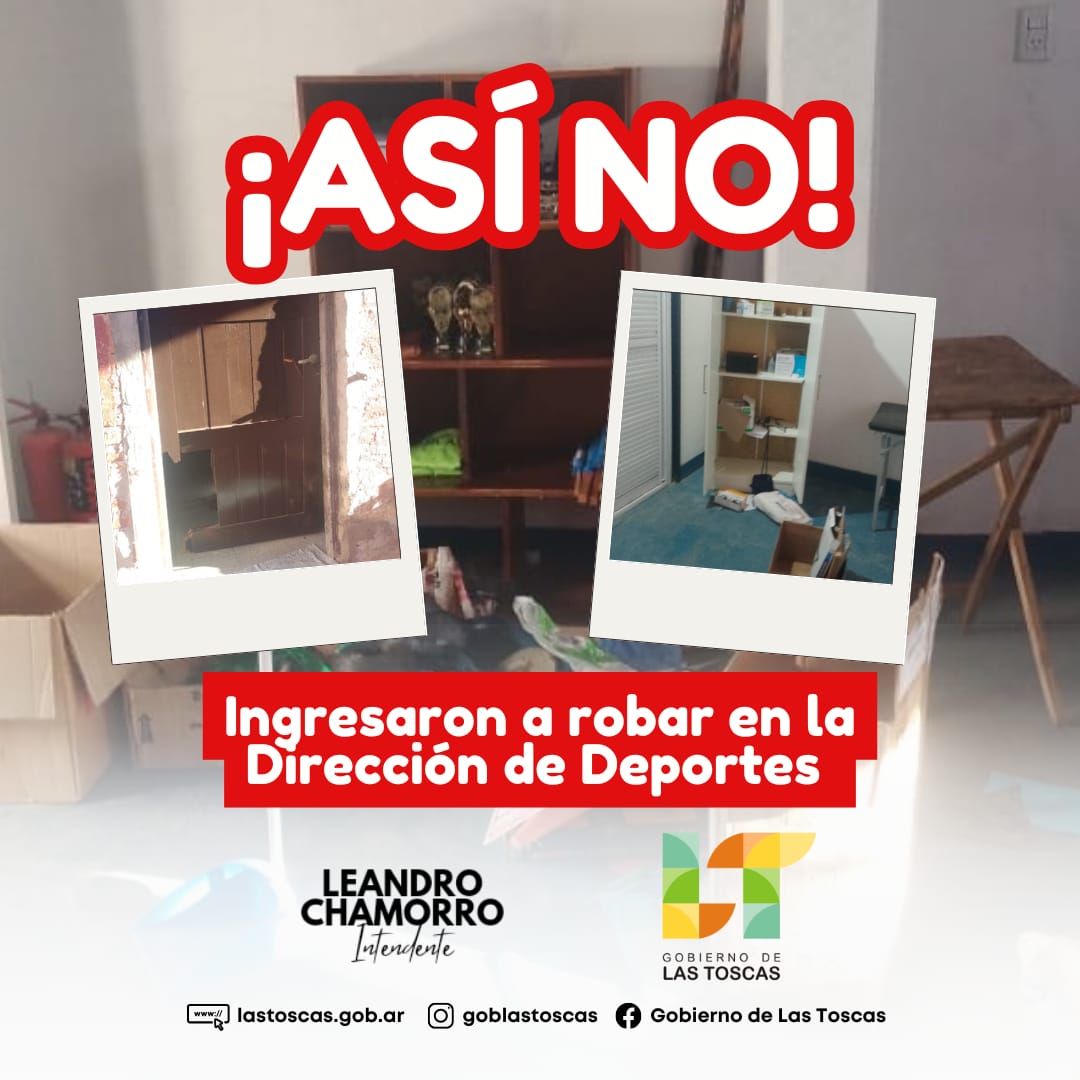 Una vez más, la municipalidad de Las Toscas sufrió el lamentable robo en la Oficina de la Dirección de Deportes del barrio Santa Lucía, donde personas ingresaron de manera violenta, rompiendo puertas y ventanas, causando destrozos y llevándose materiales de trabajo esenciales para las actividades.