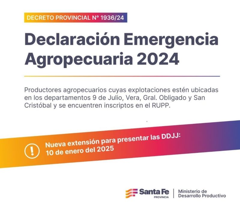 El Gobierno de Santa Fe anunció la extensión del plazo para que los productores agropecuarios afectados por la sequía en los departamentos 9 de Julio, Vera, General Obligado y San Cristóbal presenten la declaración jurada de daños necesaria para obtener el Certificado de Emergencia Agropecuaria. La nueva fecha límite es el 10 de enero de 2025.