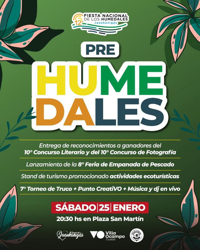 El próximo sábado 25 de enero , a partir de las 20:30 horas, la Plaza San Martín de la ciudad de Villa Ocampo será el epicentro del “Pre Humedales”, un evento cargado de actividades para toda la comunidad que marca el inicio de los festejos rumbo a la 12° Fiesta Nacional de los Humedales “Jaaukanigás”, que se realizará el 1 de febrero.