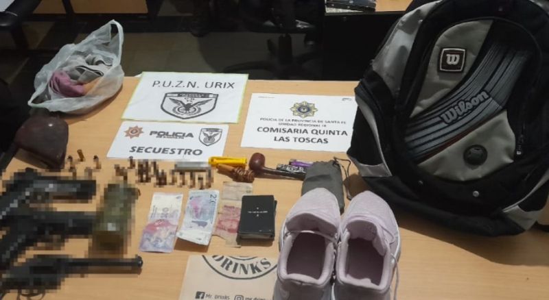 En la requisa de su mochila, contenia (01) par de zapatilla, marca Puma, (01) bolso de tela vegetal y en su interior (02) replicas de pistola, CO2, Gas Comprimido, (01) una marca WHALTER, modelo CP99, color negro, con su respectivo cargador, (01) replica de pistola marca Daisy, Modelo 93 CO2, color negro, con tubo de gas y un tubo de gas de repuesto, (01) Revolver, marca Colt, special, con cartuchos en su interior, marca spl., con funda de cuero de color marrón, (01) bolsita color gris, conteniendo en su interior (18) cartuchos, (01) pipa de madera color caoba, (01) pipa de picana con hueso, (02) encendedores marca Bic, trecientos veinte pesos argentinos ($320), (01) mazo de naipes, (01) bolsa de nylon con (01) remera, (01) frasco de vidrio con tapa metálica, conteniendo en su interior sustancia vegetales, de similares características al cannabis.