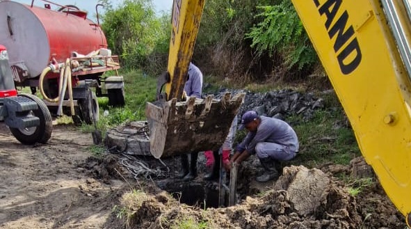 COTELVO Servicios informa que se están realizando trabajos de desobturación en el tramo final de la colectora del sistema cloacal que une la estación elevadora del barrio Ocampo Samanés con las piletas de tratamiento ubicadas al oeste del casco urbano.