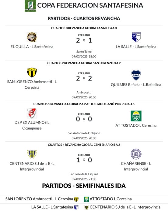 DeportesDestacadas Copa Federación: Resultados de las Revanchas de Cuartos de Final 10 marzo, 2025 Compartir en Facebook Compartir en Twitter tweet Se jugaron los cuartos de final, partidos revanchas de la Copa Federación Santafesina, estando confirmadas las semifinales de este torneo. gentileza estilo deportivo