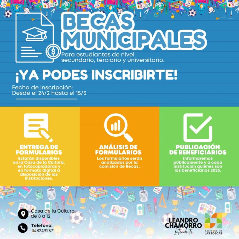 El gobierno de la ciudad de Las Toscas informa a los estudiante de nivel secundario, terciario y/o universitario, ya se puede retirar el formulario para inscribirse a las Becas Municipales de este año.