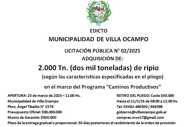 Destacadassociales Villa Ocampo: Licitación pública para ripio 13 marzo, 2025 Compartir en Facebook Compartir en Twitter tweet La municipalidad de Villa Ocampo llama a licitación pública para la adquisicion de dos mil toneladas de ripio.