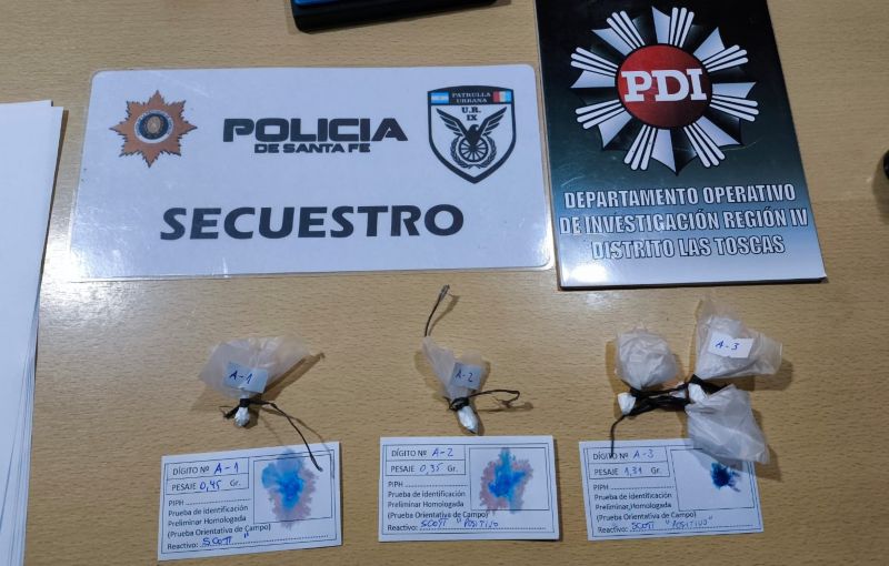 La U.R. IX de Las Toscas, informa que con fecha 27-03-25 – a las 21,30 horas, personal de la Patrulla Urbana Zona Norte, momentos que realizaba patrullaje preventivo en calles 17 y 14, secuestra envoltorios de cocaína.