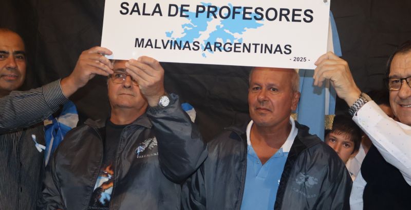 En la continuidad del acto, se realizó el descubrimiento de una placa que da nombre a la sala de profesores del Colegio «José Manuel Estrada» N° 8125, lugar que a partir de ahora llevará el nombre de «Islas Malvinas». Este homenaje se realizó junto al intendente, el director de la institución educativa y los veteranos presentes, reafirmando el compromiso con la Causa Malvinas.