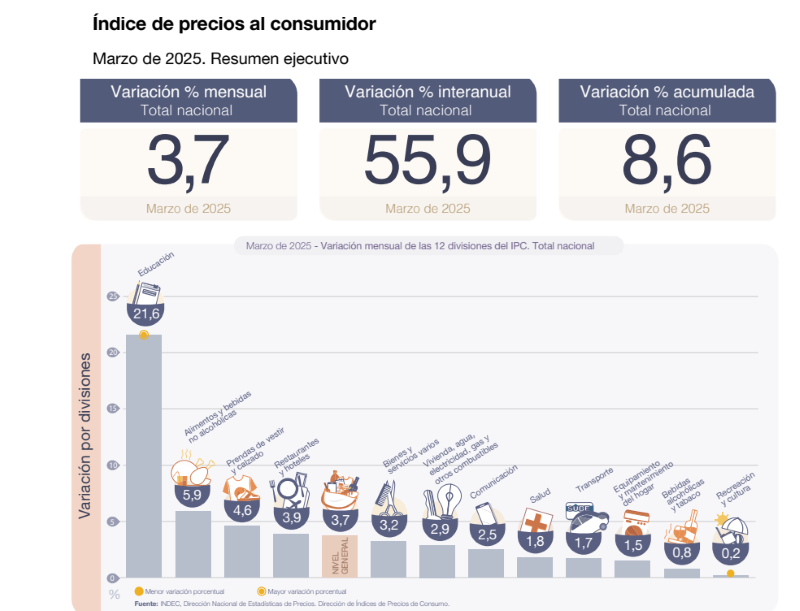 El dato marca una aceleración de 1,3 puntos en relación a febrero y es el número más alto desde agosto del año pasado. La división de mayor aumento fue Educación, que creció un 21,6% por el inicio de clases.