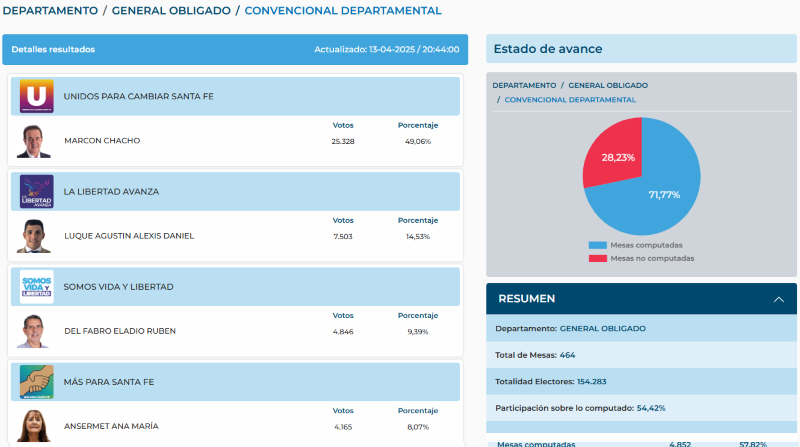 Tendencia favorable al oficialismo en la provincia y en el departamento Obligado. Con mesas aún sin computar, los primeros resultados muestran una clara ventaja para el oficialismo. Maximiliano Pullaro se impone a nivel provincial, mientras que Orfilio Marcón consolida su liderazgo en el departamento General Obligado.