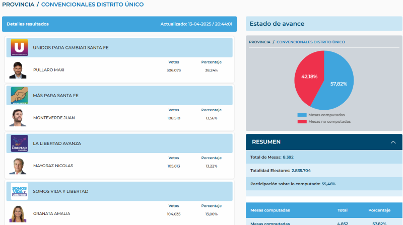 Aunque el escrutinio no ha finalizado y todavía restan mesas por computarse, los guarismos preliminares perfilan una victoria clara del oficialismo tanto en el ámbito provincial como en el departamento General Obligado. Los datos actuales indican una sólida performance del gobernador Maximiliano Pullaro, quien obtiene un amplio respaldo en la elección de convencionales por distrito único.