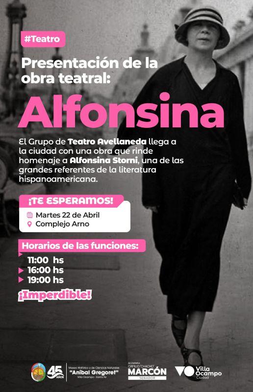Este martes 22 de abril se presentará en Villa Ocampo la obra “Alfonsina”, a cargo del reconocido Grupo de “Teatro Avellaneda”; una propuesta escénica que rinde tributo a la destacada escritora y poetisa Alfonsina Storni, una de las figuras más relevantes de la literatura hispanoamericana.