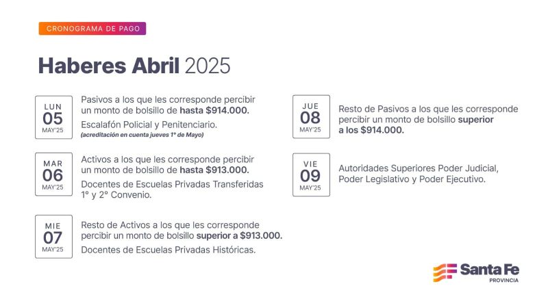 El Gobierno Provincial, a través del Ministerio de Economía, informó que los haberes del mes de abril se percibirán a partir del lunes 5 de mayo (el primer turno correspondiente al escalafón policial y pasivos que cobren hasta $ 914.000 lo tendrá acreditado el jueves 1°), finalizando el pago para el personal de planta del Estado y jubilados el jueves 8. En tanto que las autoridades superiores de los tres poderes lo cobrarán el viernes 9.