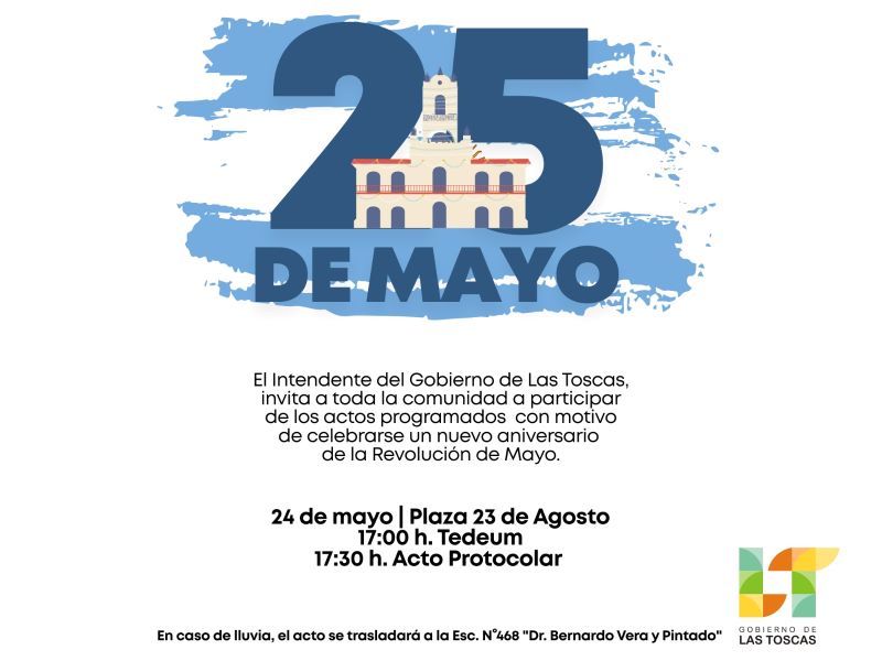El Gobierno de Las Toscas, invita a toda la comunidad a participar de los actos programados con motivo de celebrarse un nuevo Aniversario de la Revolución de Mayo.