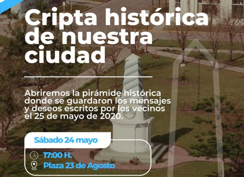 Este sábado 24 de mayo a las 17 horas, se abrirá la cripta histórica ubicada en la pirámide de Plaza 23 de Agosto. Allí fueron guardados los mensajes y deseos que los vecinos escribieron en un momento muy especial para esta ciudad.