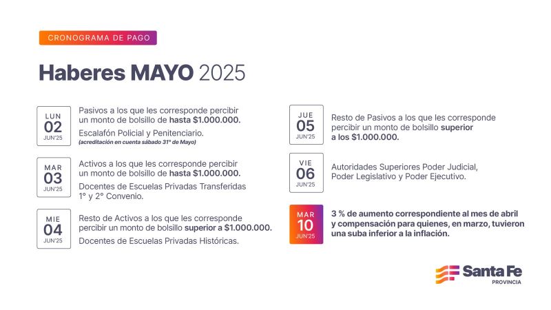 El Gobierno Provincial, a través del Ministerio de Economía, informó que los haberes del mes de mayo se percibirán a partir del lunes 2 de junio (el primer turno correspondiente al escalafón policial, penitenciario y pasivos que cobren hasta $1.000.000 lo tendrá acreditado el sábado 31 de mayo), finalizando el cronograma de pago el viernes 6.