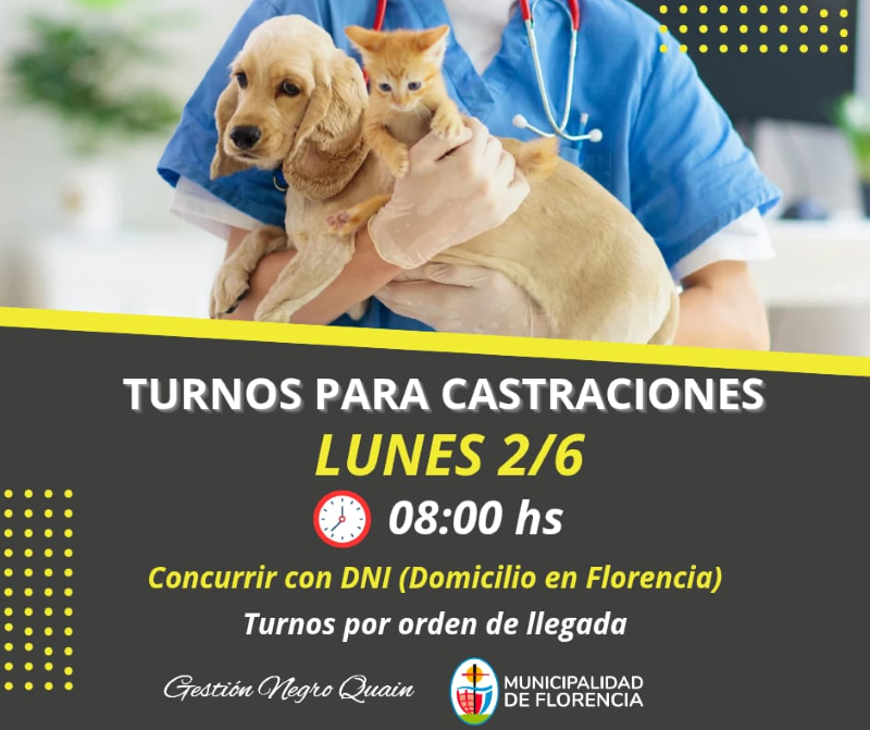 La Municipalidad de Florencia anunció que este lunes 2 de junio se realizará la entrega de turnos para las castraciones gratuitas de perros y gatos, un beneficio muy importante para la comunidad y el bienestar de los animales.