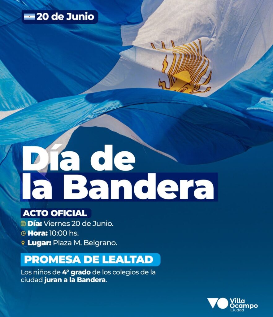 La municipalidad de Villa Ocampo, informa el programa de acto conmemorativo al Día de la Bandera, para este próximo 20 de junio en plaza Belgrano, de esta ciudad.