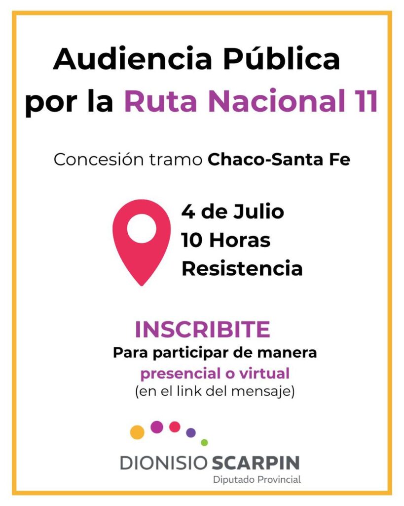 Este viernes 4 de julio a las 10 horas se realiza en Resistencia (Auditorio de la Dirección de Nacional Vialidad) la Audiencia Pública por la Ruta Nacional 11 y otros tramos estratégicos de la Red Federal de Concesiones, en el Auditorio de la Dirección Provincial de Vialidad ubicado en Av. 25 de Mayo y Ruta Nacional Nº 11, Resistencia – Chaco.