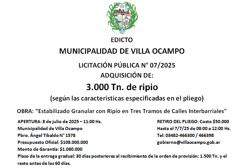 Destacadassociales Villa Ocampo; Licitarán 3.000 tn. de ripio 1 julio, 2025 Compartir en Facebook Compartir en Twitter tweet La municipalidad de Villa Ocampo llama a licitación pública para la adquisición de 3.000 tn. de ripio, para la obra: «estabilizado granular con ripio en tres tramos de calles interbarrriales».