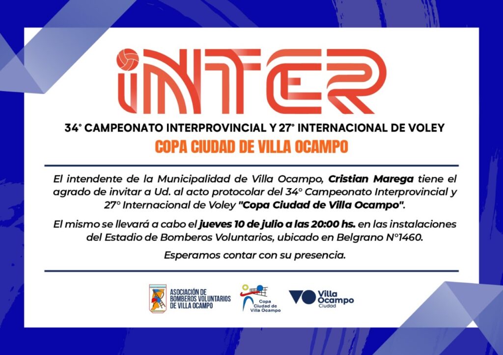 Desde este jueves 10 de julio y hasta el domingo 13, la ciudad vivirá el 34° Campeonato Interprovincial y 27° Internacional de Voley «Copa Ciudad de Villa Ocampo», en las instalaciones de Bomberos Voluntarios, la UPAC Virgen Niña y El Instituto General Manuel Obligado.