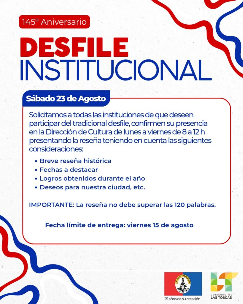 Solicitamos a todas las instituciones que deseen participar del tradicional desfile, confirmen su presencia en la Dirección de Cultura de lunes a viernes de 8 a 12 h. presentando la reseña teniendo en cuenta las siguientes consideraciones: