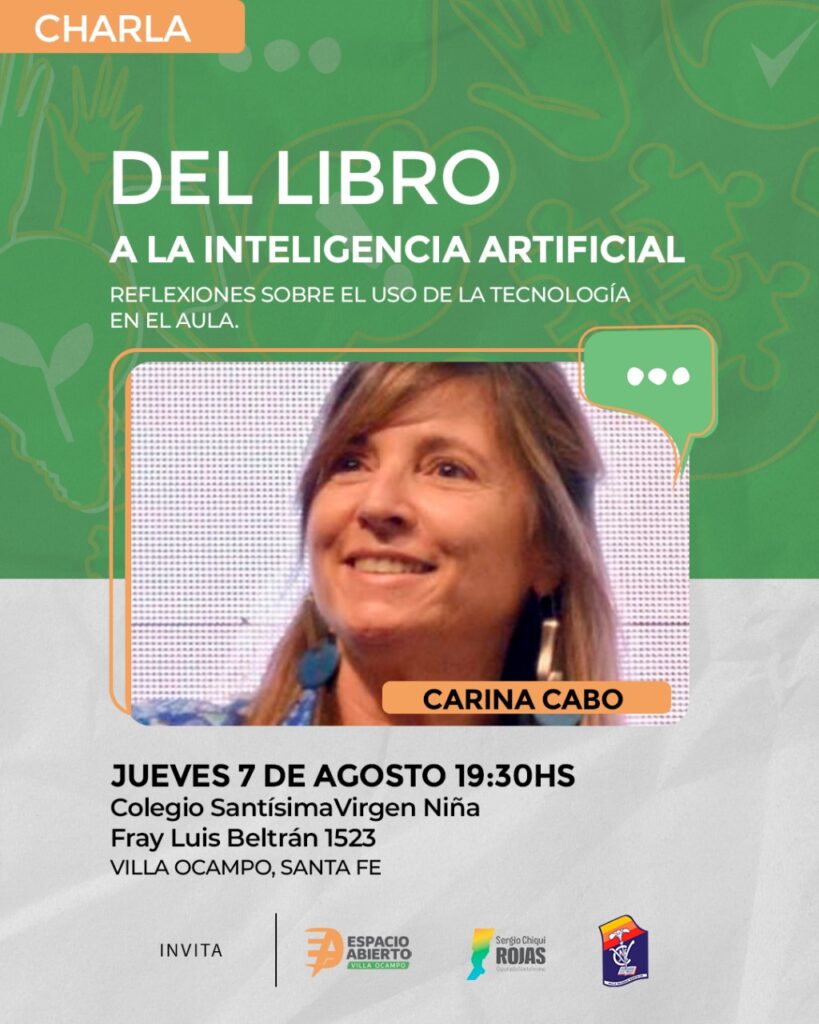 La charla titulada “Del libro a la inteligencia artificial”, a cargo de la Dra. Carina Cabo, especialista en educación y tecnologías, será el jueves 7 de agosto, a las 19:30 hs., en el SUM del ISPI N° 4026 «Santísima Virgen Niña» (Fray Luis Beltrán 1523), con entrada libre y gratuita.