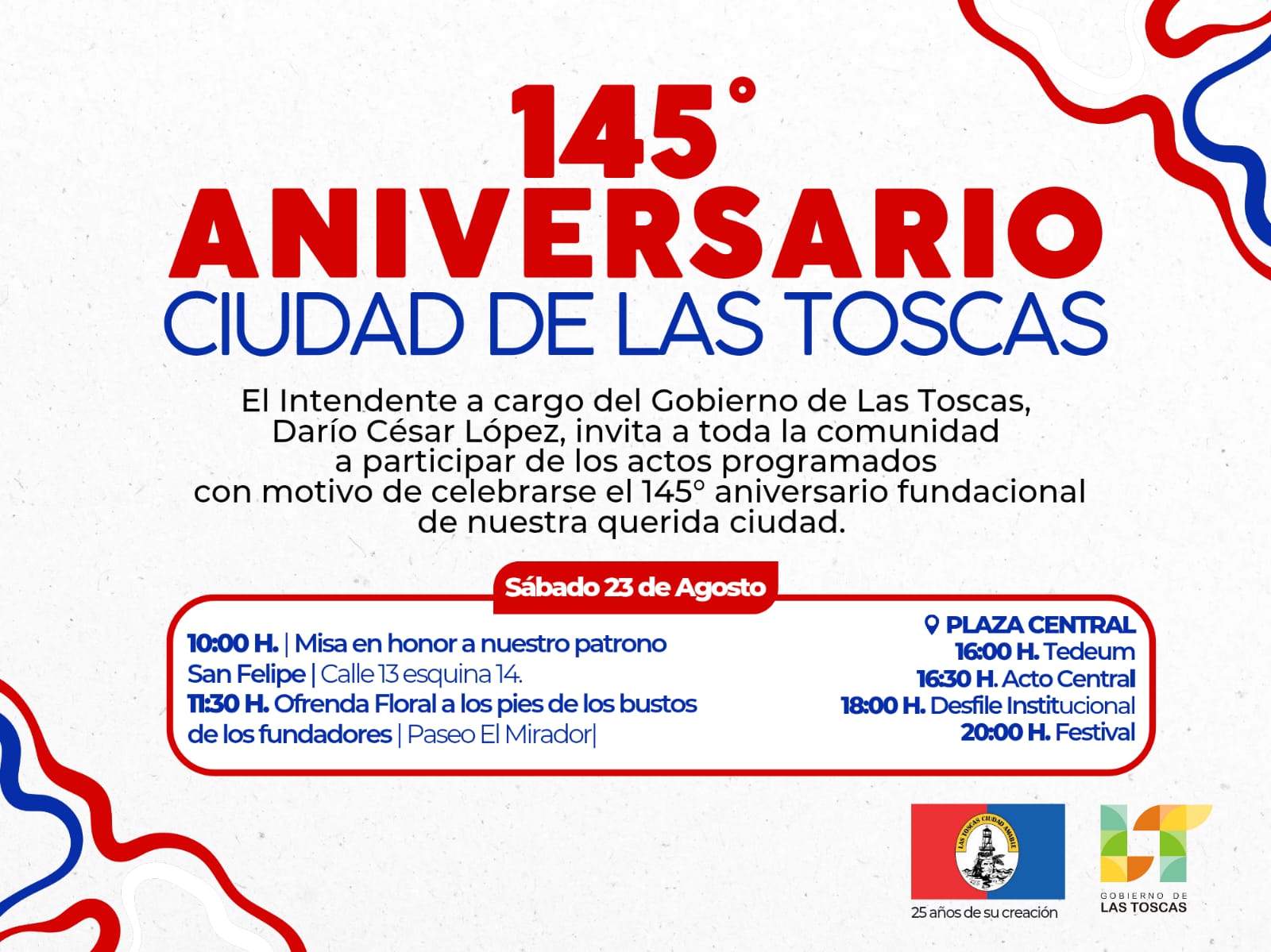 El Intendente a cargo del Gobierno de Las Toscas, Darío César López, invita a participar de los actos programados para celebrar el 145º aniversario de la fundación de la ciudad, el próximo sábado 23 de agosto.