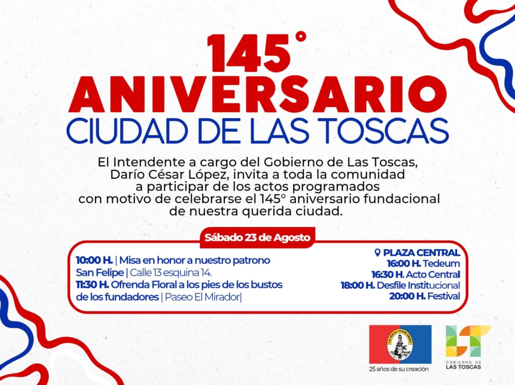 El Intendente a cargo del Gobierno de Las Toscas, Darío César López, invita a participar de los actos programados para celebrar el 145º aniversario de la fundación de la ciudad, el sábado 23 de agosto.