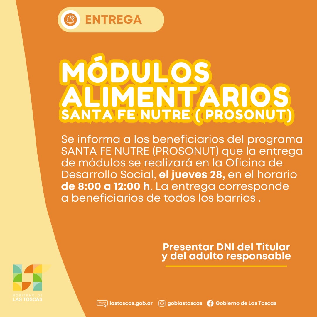 Se informa a las y los beneficiarios del programa que la próxima entrega de módulos se realizará el jueves 28 de agosto en la Oficina de Desarrollo Social, en el horario de 8:00 a 12:00h.