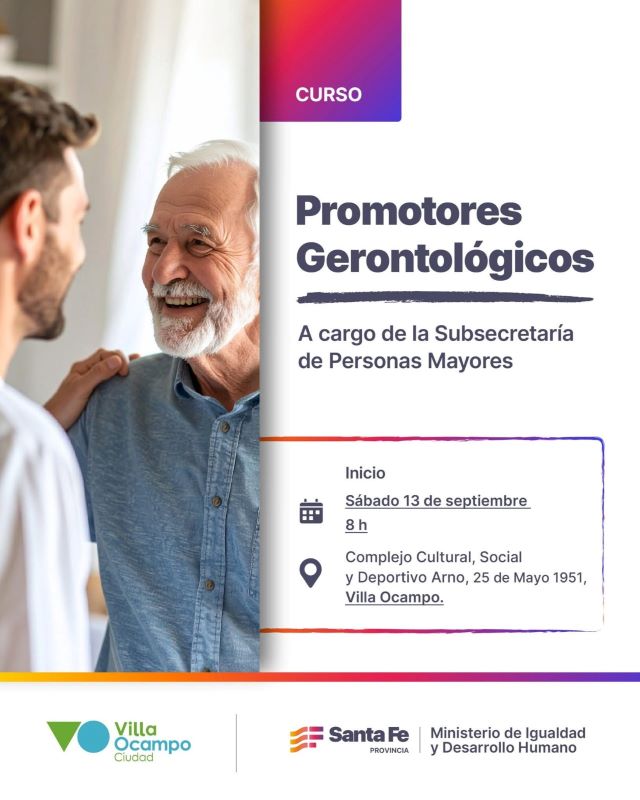 La Secretaría de Desarrollo Humano de la Municipalidad de Villa Ocampo informa que este sábado 13 de septiembre, a las 8:00 Hs. en el Complejo Arno, se llevará a cabo el Curso de Promotores Gerontológicos, a cargo de la Subsecretaría de Personas Mayores de la Provincia.