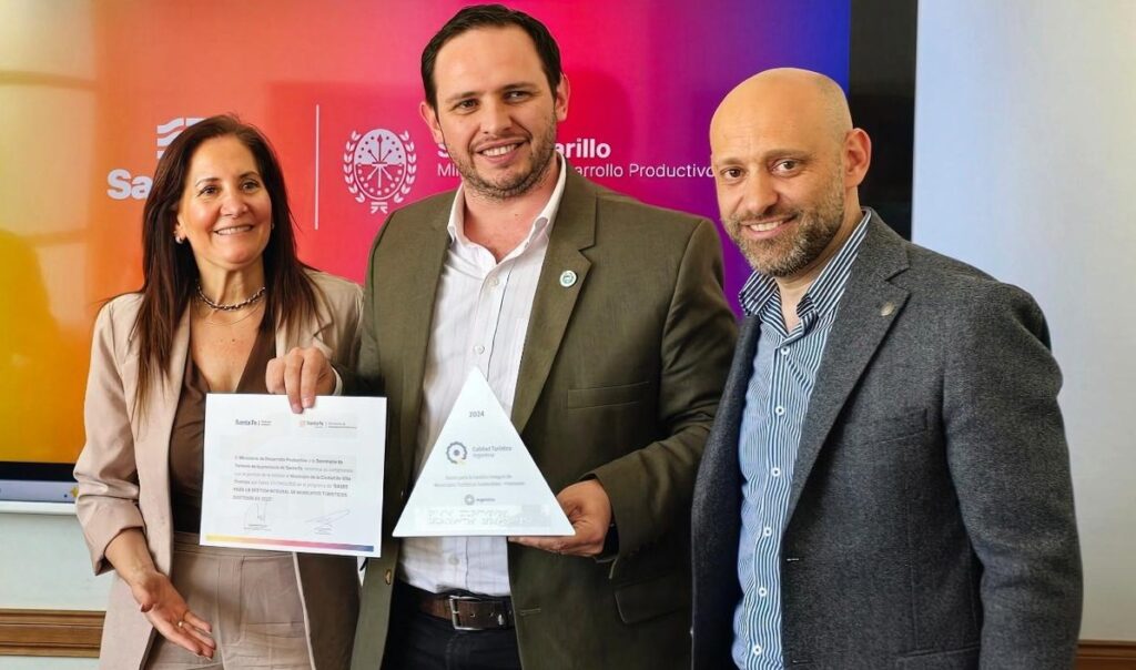 El intendente Cristian Marega recibió del ministro de Desarrollo Productivo de la Provincia, Gustavo Puccini; y de la secretaria provincial de Turismo, Marcela Aeberhard, un reconocimiento por el compromiso de la Municipalidad de Villa Ocampo con la gestión de calidad en turismo sostenible.