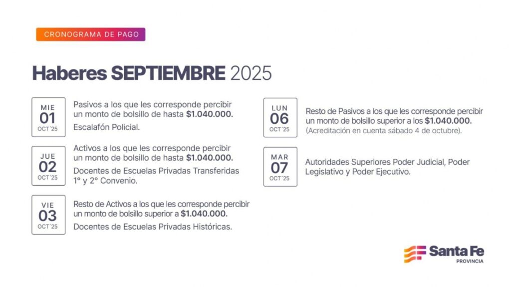 El Gobierno Provincial, a través del Ministerio de Economía, informó que los haberes del mes de septiembre se percibirán a partir del miércoles 1 de octubre finalizando el martes 7. Los haberes contemplan el aumento acordado en paritaria, completando hasta el momento un 4 % (1,5 % en julio, 1,5 % en agosto y 1 % por septiembre).