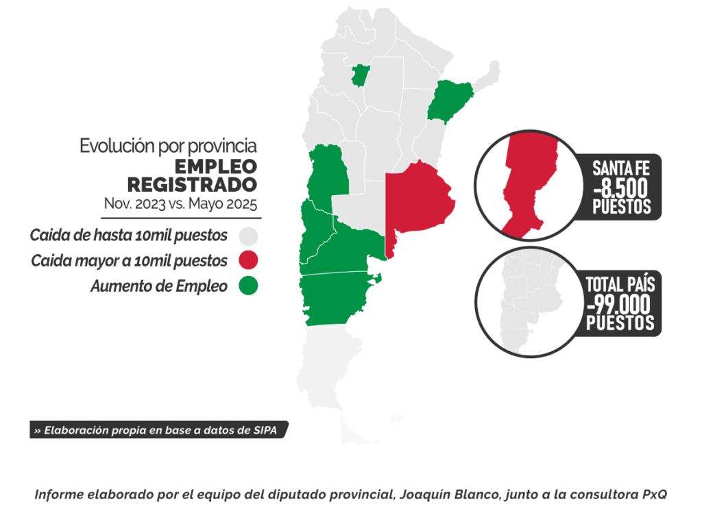 Un informe del nivel de actividad y empleo presentado por el diputado provincial del socialismo y presidente de la Comisión de Asuntos Laborales de la Cámara de Diputados, Joaquín Blanco, en conjunto a la consultora PxQ, demuestra que la recesión económica a nivel nacional impacta en la provincia de Santa Fe. “Estamos frente a una situación alarmante: el modelo económico que impulsa el gobierno de Milei castiga a la producción, destruye empleos y genera cada vez más incertidumbre en las familias trabajadoras”, sostuvo.