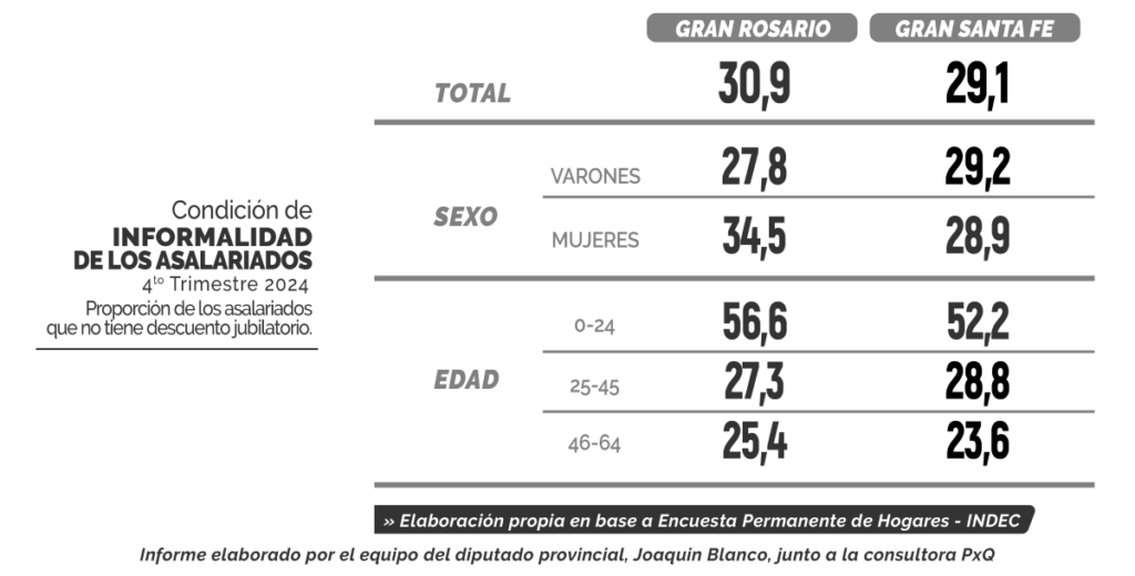 El informe también muestra que los jóvenes y las mujeres son los más afectados por la situación de informalidad. “Según pudimos observar, para el cuarto trimestre de 2024, una de cada tres mujeres no tenía aportes jubilatorios ni obra social, y con los jóvenes esa situación se profundiza porque la mitad se encuentra bajo una situación de precarización laboral”, explicó el diputado.