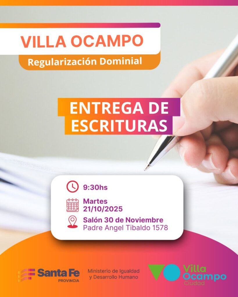 Este martes 21 de octubre se llevará a cabo en Villa Ocampo el acto de entrega de escrituras en el marco del programa de Regularización Dominial, impulsado por el Gobierno de la Provincia de Santa Fe a través del Ministerio de Igualdad y Desarrollo Humano, junto a la Municipalidad de Villa Ocampo.
