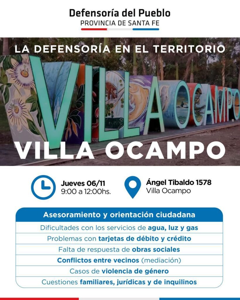 La Municipalidad de Villa Ocampo informa a la comunidad que, este jueves 06 de noviembre, se hará presente en la ciudad la Defensoría del Pueblo de la Provincia de Santa Fe, con el fin de brindar asesoramiento y orientación ciudadana.