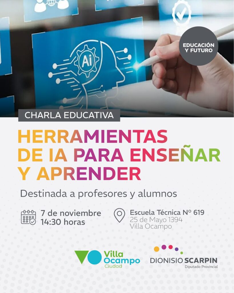 La Municipalidad de Villa Ocampo informa que el próximo viernes 7 de noviembre a las 14:30 horas, se llevará a cabo la charla educativa “Herramientas de IA para enseñar y aprender”, destinada a docentes y estudiantes de la ciudad.
