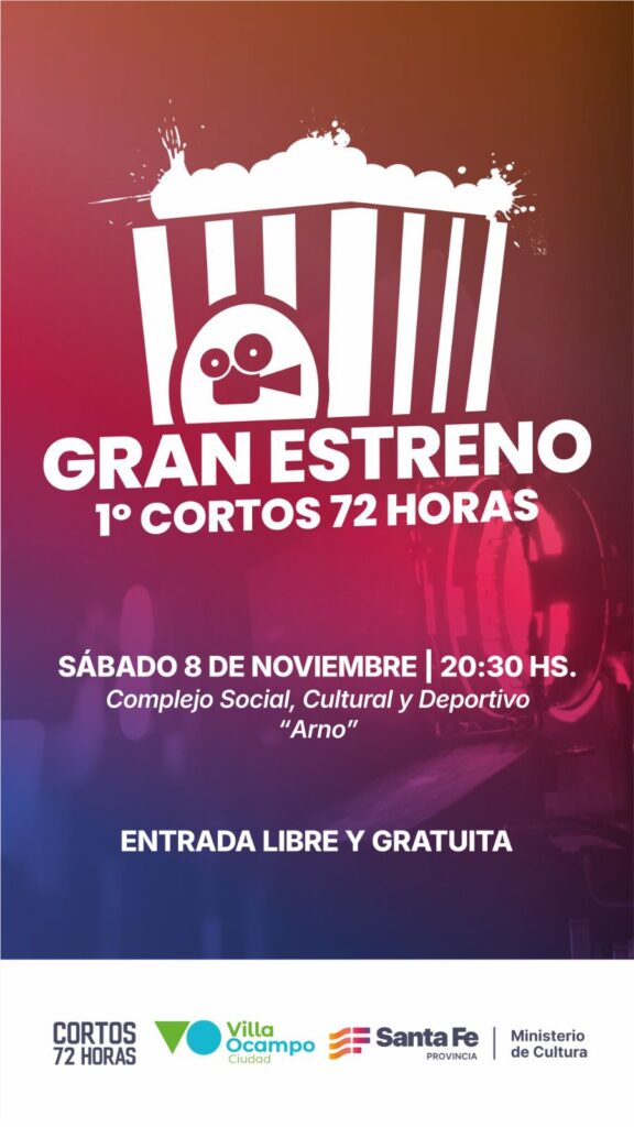 La Municipalidad de Villa Ocampo, junto al Ministerio de Cultura de la Provincia de Santa Fe, invita a toda la comunidad a participar del gran estreno del 1° «Cortos 72 Horas», una propuesta audiovisual que promueve la creatividad, el trabajo en equipo y el talento local.