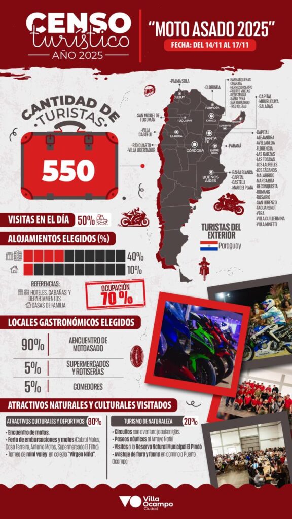 La Municipalidad de Villa Ocampo comparte los principales resultados del Censo Turístico 2025 realizado durante el evento “Moto Asado 2025”, desarrollado del 14 al 17 de noviembre, que una vez más consolidó a nuestra ciudad como un punto de encuentro mototurístico de relevancia regional.