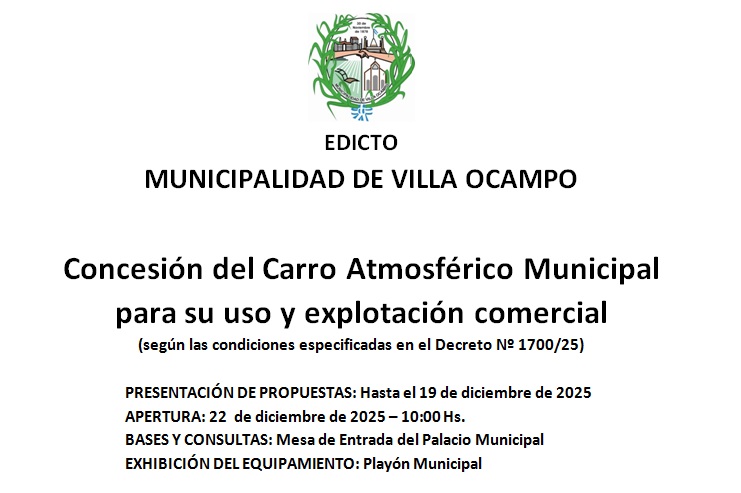 Destacadassociales Villa Ocampo: Edicto Municipal sobre la Concesión del Carro Atmosférico 5 diciembre, 2025 Compartir en Facebook Compartir en Twitter tweet