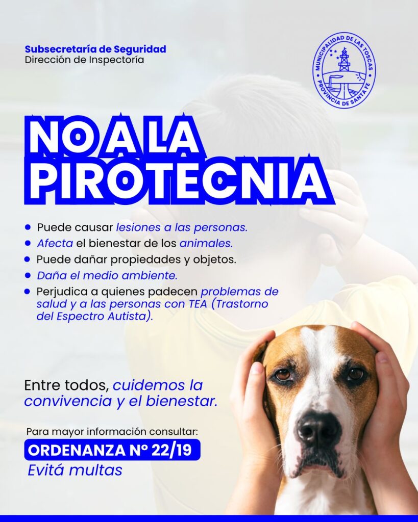 Con el objetivo de cuidar la salud de las personas, el bienestar animal, el ambiente y la tranquilidad de la comunidad, se encuentra vigente en la ciudad la Ordenanza Nº 22/19, que regula el uso y la venta de pirotecnia. La normativa permite únicamente la pirotecnia sin estruendos, priorizando celebraciones seguras y responsables para todos.