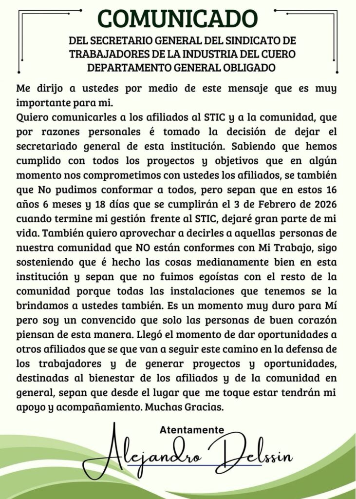 El Secretario General del Sindicato de Trabajadores de la Industria del Cuero (STIC), Alejandro Delssin, anunció oficialmente que por razones personales dejará su cargo el próximo 3 de febrero de 2026.
