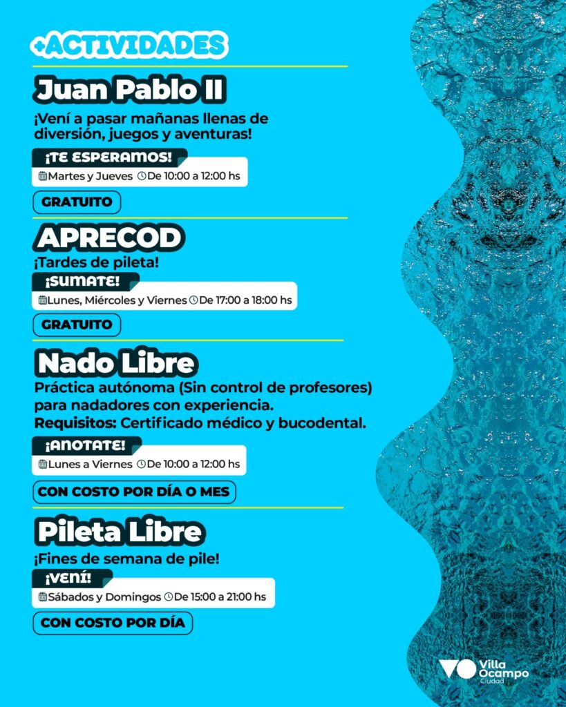 La Municipalidad de Villa Ocampo informa a la comunidad que los jóvenes que forman parte de la comunidad de Juan Pablo II y APRECOD cuentan con acceso gratuito a la pileta del Jockey Club, en el marco de las actividades de verano impulsadas por el Municipio.