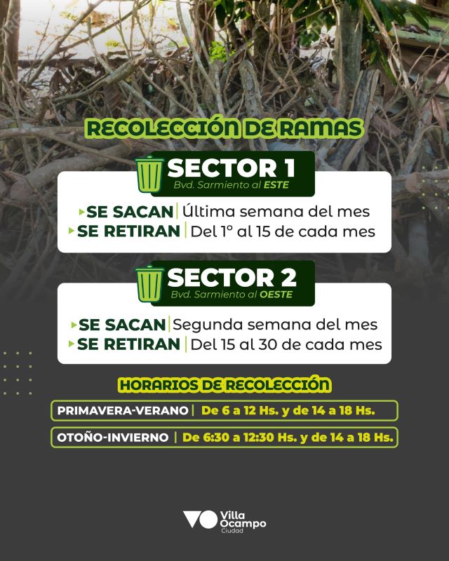 La Municipalidad de Villa Ocampo recuerda a los vecinos el cronograma vigente de recolección de ramas, con el objetivo de mantener el orden, la limpieza y el correcto funcionamiento del servicio en toda la ciudad.