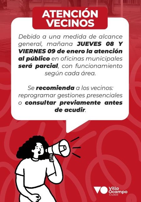 Se informa a la comunidad que el jueves 8 y el viernes 9 de enero, la atención al público en las oficinas municipales se verá afectada y será parcial debido al paro dispuesto por FESTRAM, en el marco del reclamo por la reapertura de paritarias municipales.