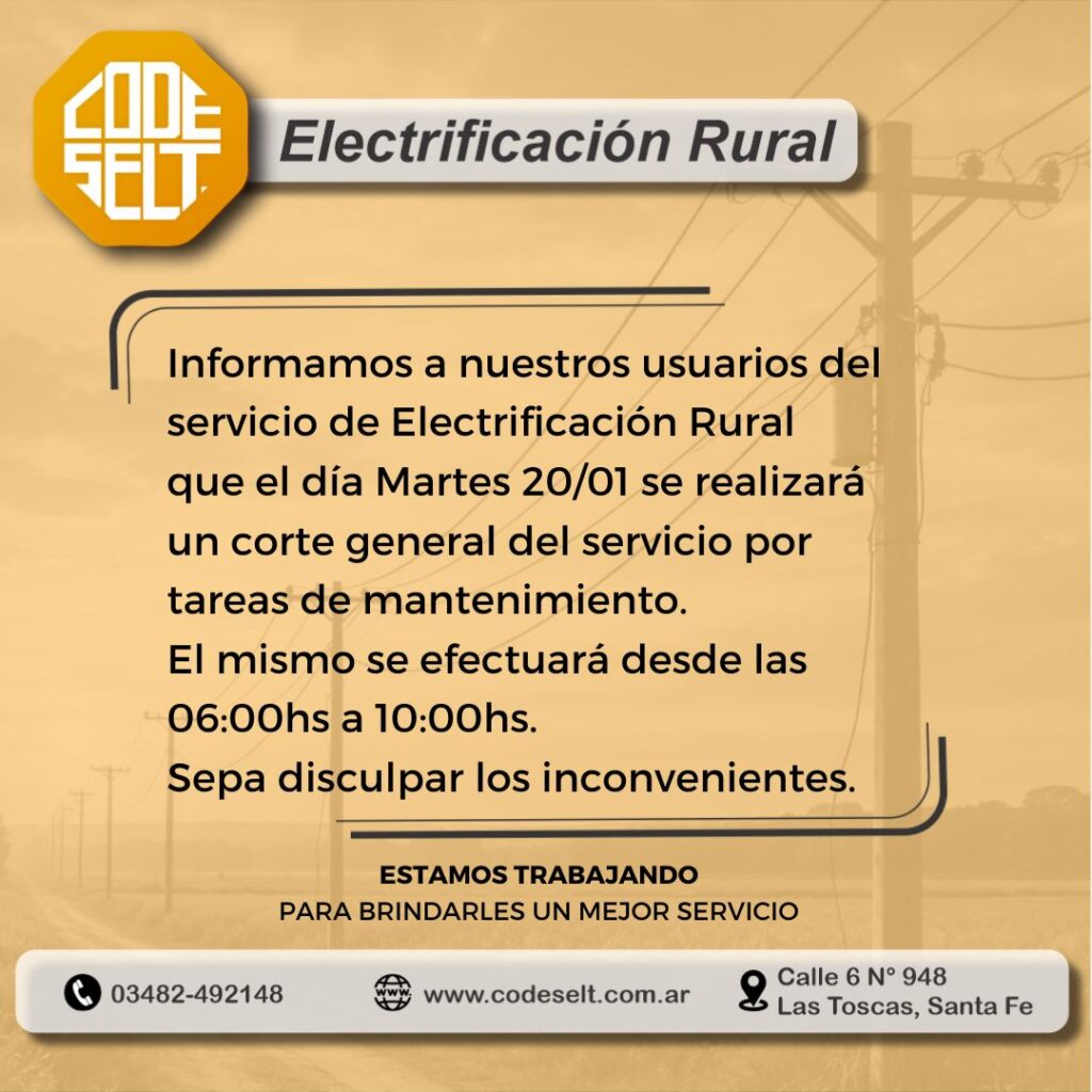 La Cooperativa de Servicios Eléctricos de Las Toscas Ltda. (CODESELT) informó a los usuarios del servicio de Electrificación Rural que el próximo martes 20 de enero se llevará a cabo un corte general del suministro eléctrico debido a tareas de mantenimiento programadas.