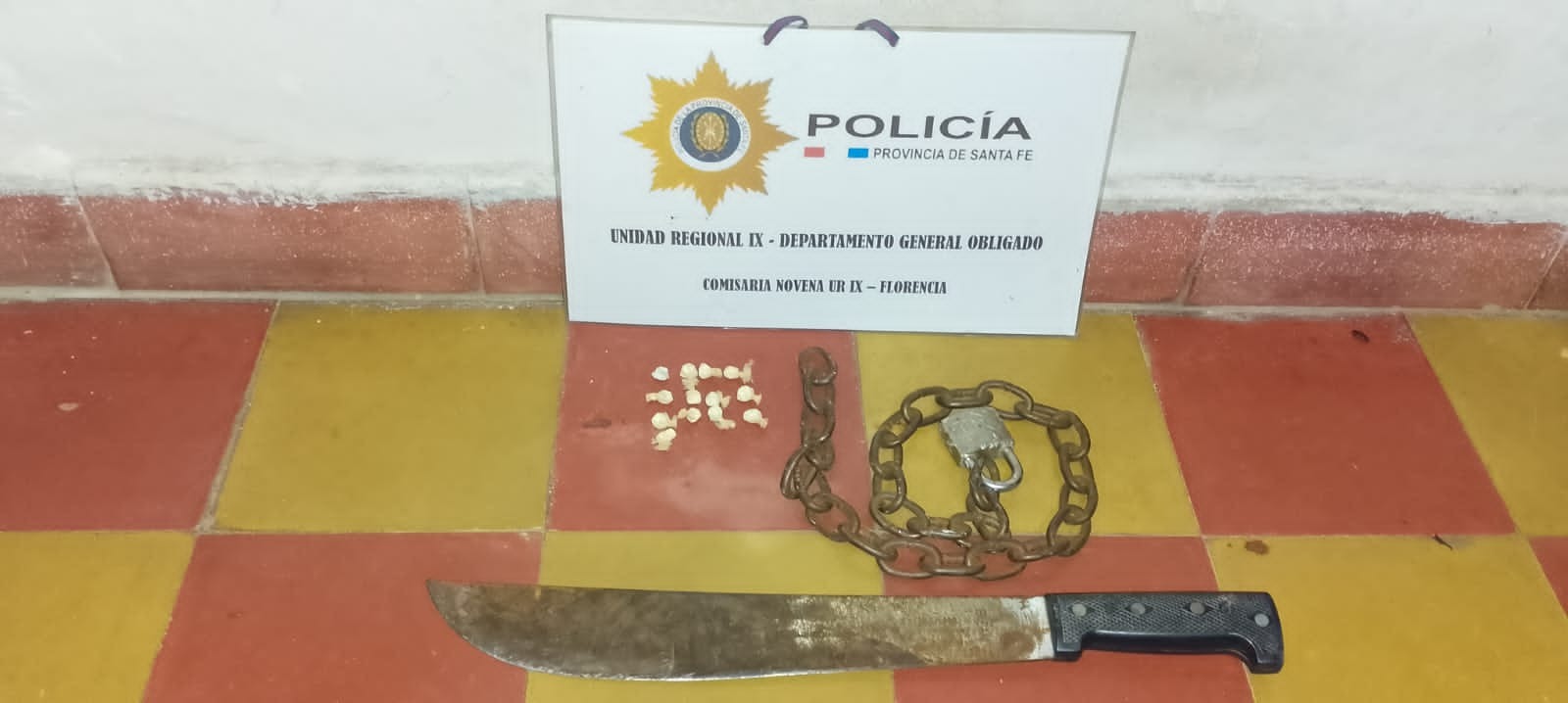 Durante el procedimiento se incautó un (01) machete marca Ciriri y una (01) cadena de hierro con un candado en uno de sus extremos. Asimismo, entre las prendas de vestir del aprehendido se halló un envase de pastillas tipo Tic Tac que contenía trece (13) envoltorios de nylon con material pulverulento de características similares a la cocaína.