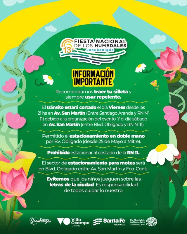 La Municipalidad de Villa Ocampo informa a los medios de comunicación y a la comunidad en general una serie de disposiciones organizativas en el marco de la XIII Fiesta Nacional de los Humedales – Jaaukanigás, que se desarrollará este sábado.