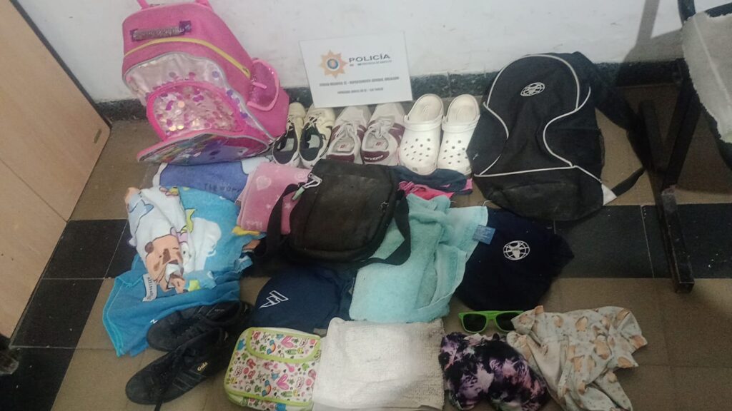 Ante esta situación, se procedió a la aprehensión del masculino y al secuestro de diversos elementos, entre ellos mochilas, prendas de vestir, calzado, toallas, accesorios y artículos personales, todos coincidentes con la denuncia radicada a las 8:30 horas del mismo día en la Comisaría IV.