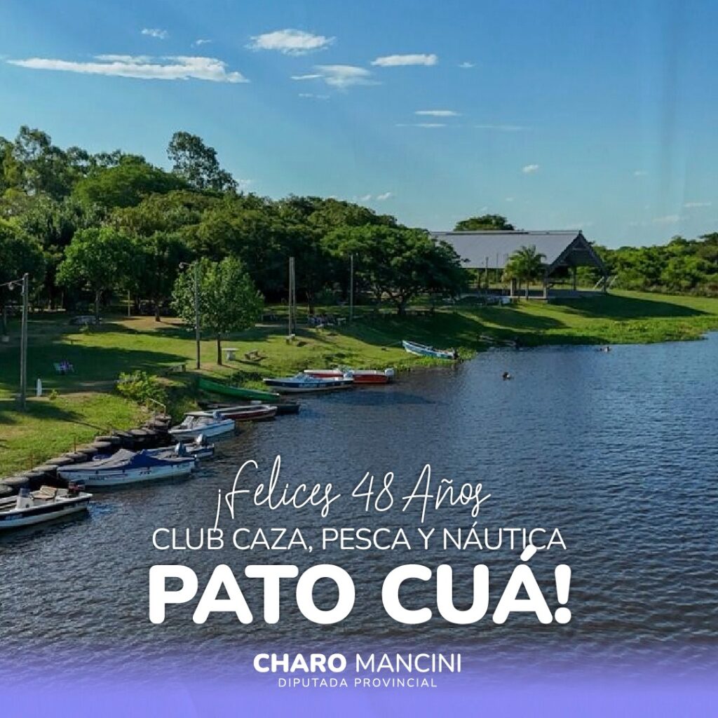 La Diputada Provincial María del Rosario Mancini saluda con afecto al Club Caza, Pesca y Náutica «PATO CUÁ» al celebrarse su 48° aniversario fundacional, y hace llegar un especial reconocimiento a su presidente Eduardo A. Fisch, a la Comisión Directiva, a sus socios y a toda la familia del club.